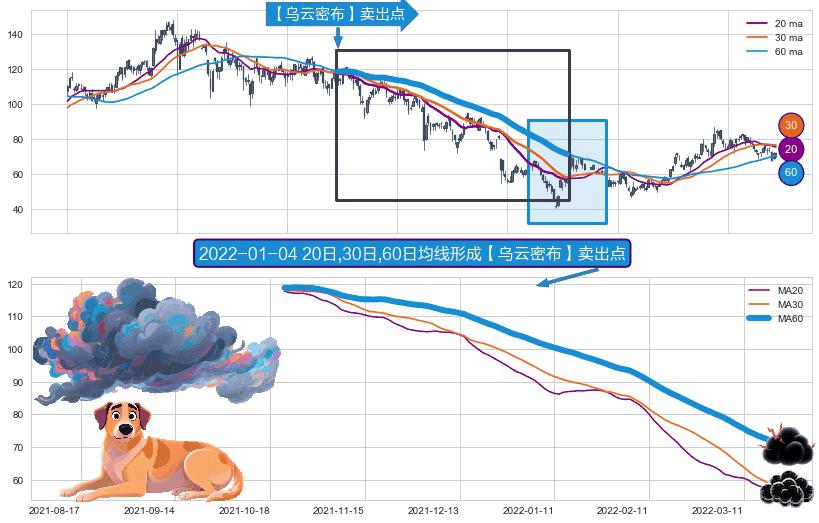 ⚀ 2021-10-21日-2022-03-22日显现 20日-30日-60日均线 【乌云密布】卖出点 看空信号,后市看跌,卖出