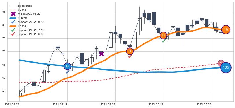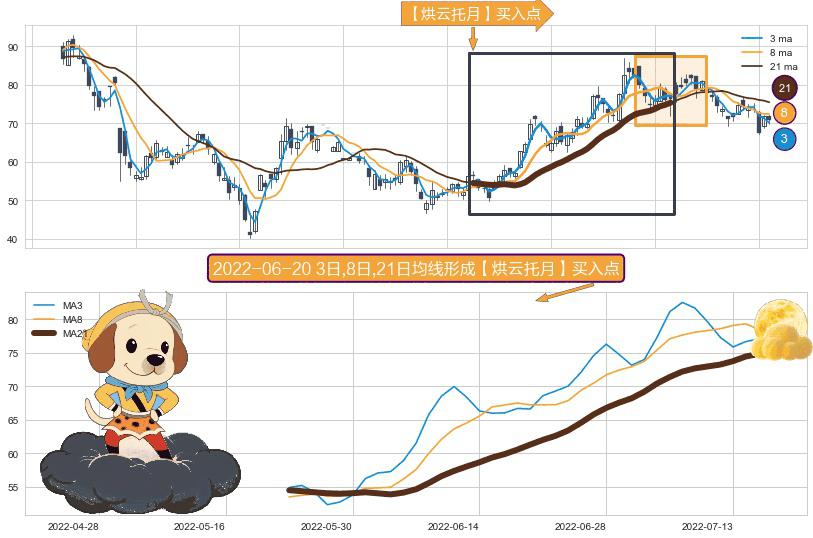 ⚀ 2022-05-23日-2022-07-18日显现 3日-8日-21日均线 【烘云托月】买入点 看多信号,后市看涨,买入