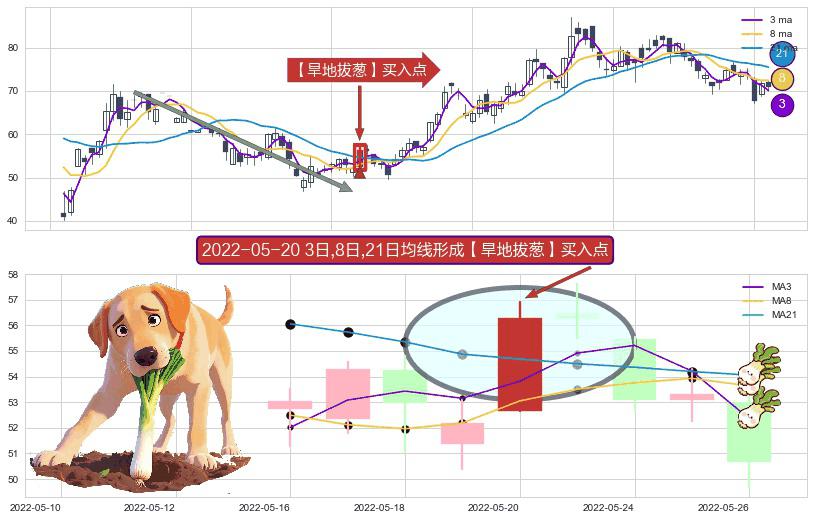 ⚀ 2022-05-20日显现 3日-8日-21日均线 【旱地拔葱】买入点 看多信号,后市看涨,买入