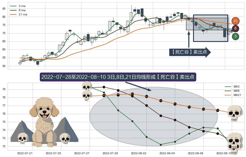 ⚀ 2022-07-29-日至2022-08-10-日显现 3日-8日-21日均线 【死亡谷】卖出点 看空信号,后市看跌,卖出