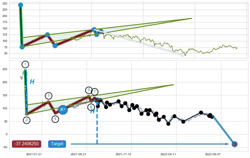➣ D点拟合预测价格221.38,距离最后交易收盘价格70.85相差 +212.47%