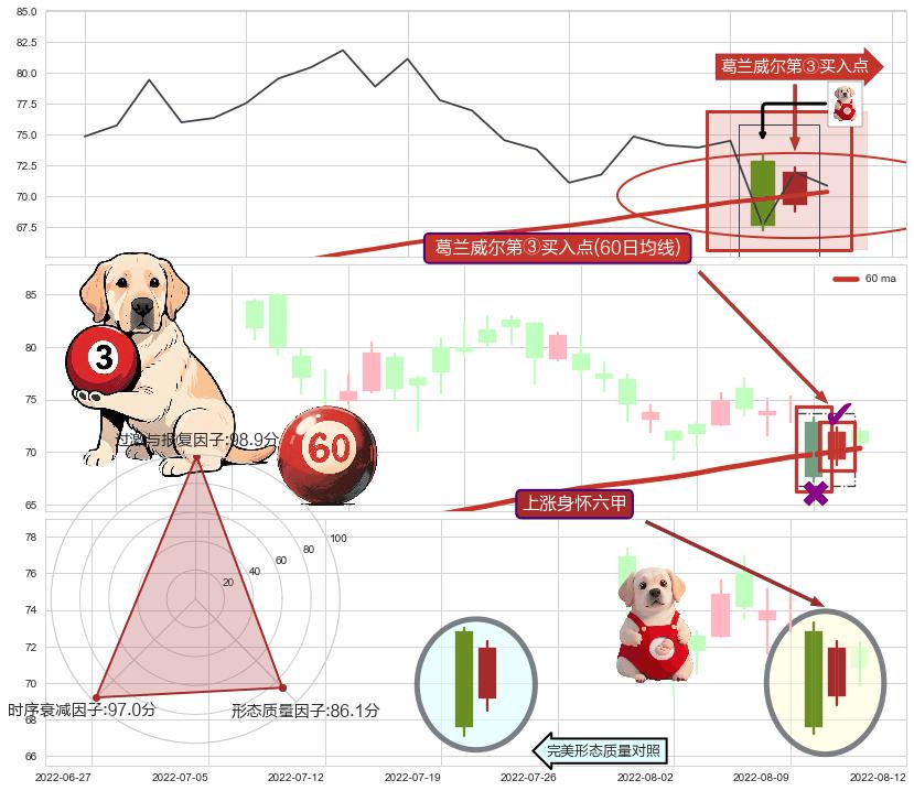 | 3 🅚:葛兰威尔第③买入点 ➕ 📡:谐波鲨鱼猜想c点下沉击穿越过b点后报复性拉升上涨(均值回复) ☞ 看多信号 ⇥ 【均线】交织【图形】⇥ 综合量化分数: 51 | > |