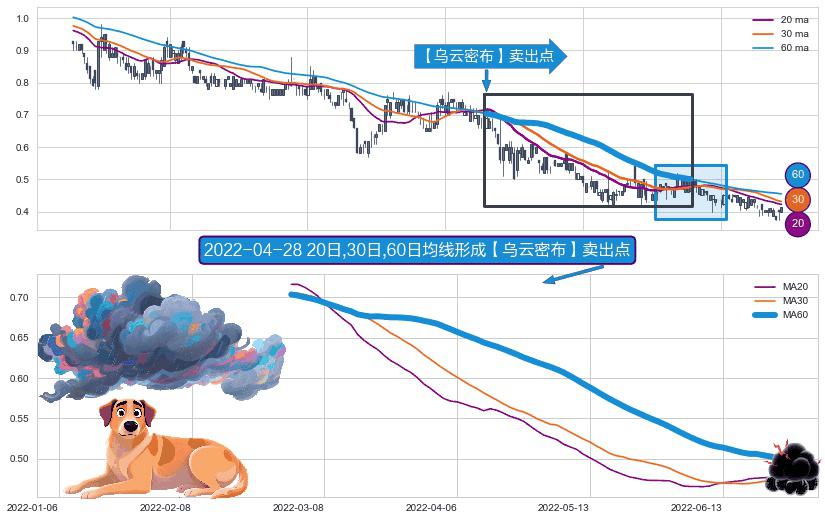 ⚀ 2022-03-01日-2022-06-27日显现 20日-30日-60日均线 【乌云密布】卖出点 看空信号,后市看跌,卖出