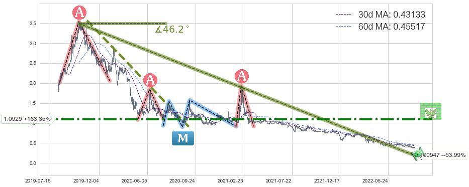 ♘ 在最后的下跌阶段2019-10-04至2022-08-12,存在 破位边缘的阻力位 ,阻力价格0.190947,可信任强度77.15%,其距离最后价格0.41500相差 -53.99%