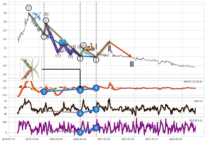 ➢ 1,3,5驱动浪MACD, RSI, KDJ走势都出现【常规背离】反转信号增强