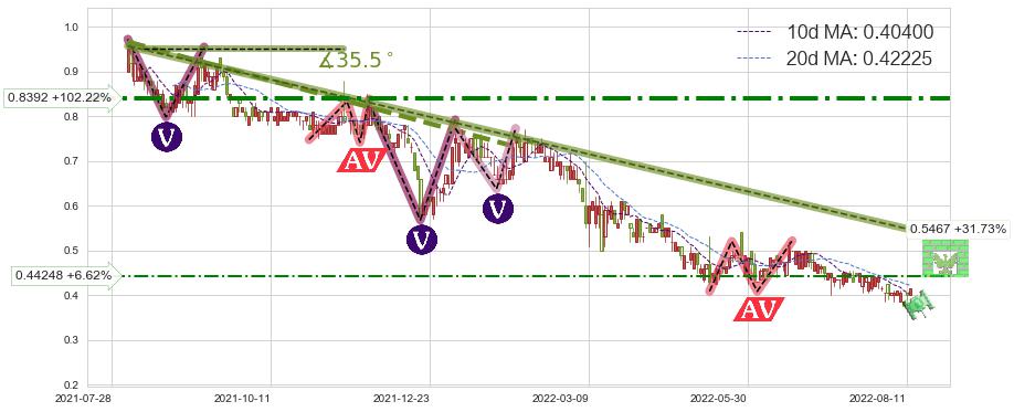 ♘ 在最后的下跌阶段2021-08-04至2022-08-12,存在 持续未破位的阻力位 ,阻力价格0.5467,可信任强度87.84%,其距离最后价格0.41500相差 +31.73%