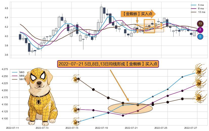 形态多维评估: ⚀ 2022-07-21日显现 5日-8日-13日均线 【金蜘蛛】买入点 看多信号,后市看涨,买入