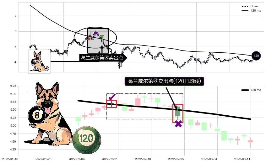 形态多维评估: ⚀ 2022-02-24-日显现 葛兰威尔均线 120日均线 第⑧卖出点 下降趋势的中继信号,后市看跌,卖出信号