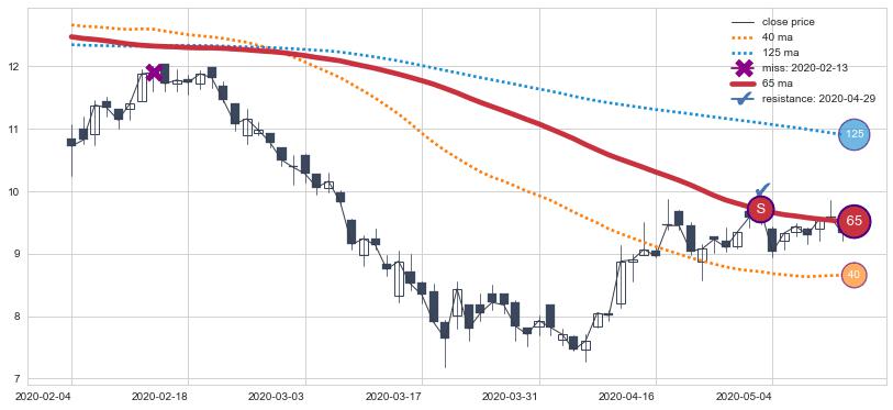 下跌趋势2020-02-04-2020-05-12,均线65确认关键阻力1处