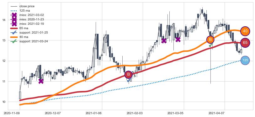 上涨趋势2020-11-09-2021-04-19,均线40, 65确认关键支撑2处