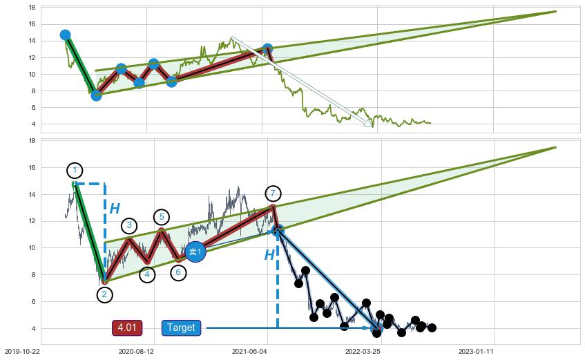 ➢ 最小中继整理跌幅→𝐇: 7.30 (𝐇楔型旗杆的长度:楔型起点→顶点)