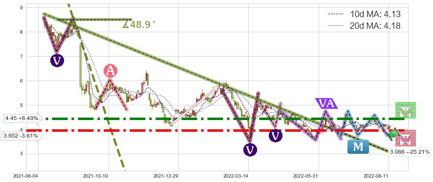 ♘ 阻力价格位4.45,可信任强度92.97%,距离最后交易2022-08-12形成的收盘价格4.10相差 +8.43%