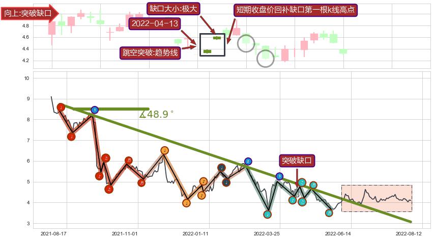 ➣ 2021-08-10-2022-06-07下跌趋势存在反转上涨[机会],其原下跌趋势的阻力位(3.066)已被突破[强支撑信号],原下跌趋势角度: 48.9˚