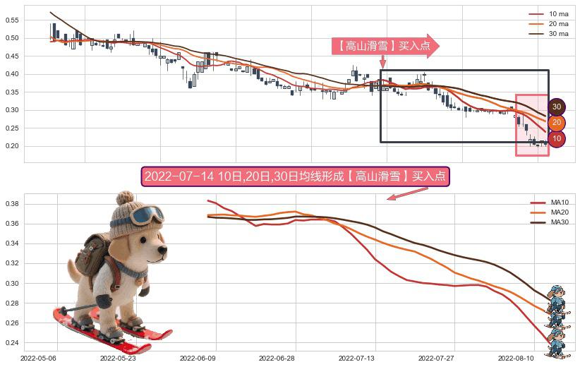 形态多维评估: ⚀ 2022-06-08日-2022-08-12日显现 10日-20日-30日均线 【高山滑雪】买入点 看多信号,后市看涨,买入
