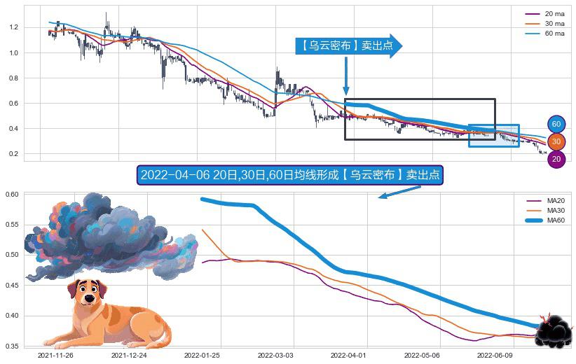 ⚃ 【乌云密布】卖出点长时间对 牛 市转 熊 市进行确认,且均线压制价格走势,但信号发出时间较长,属于【迟滞】看空卖出信号