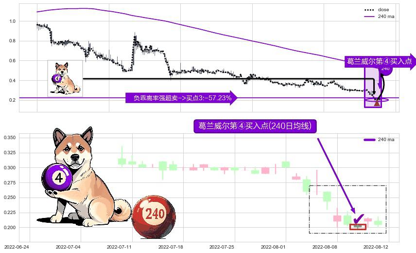 形态多维评估: ⚀ 2022-08-10-日显现 葛兰威尔均线 240日均线 第④买入点 下降趋势均值回复的短线反弹信号,后市看涨,买进信号