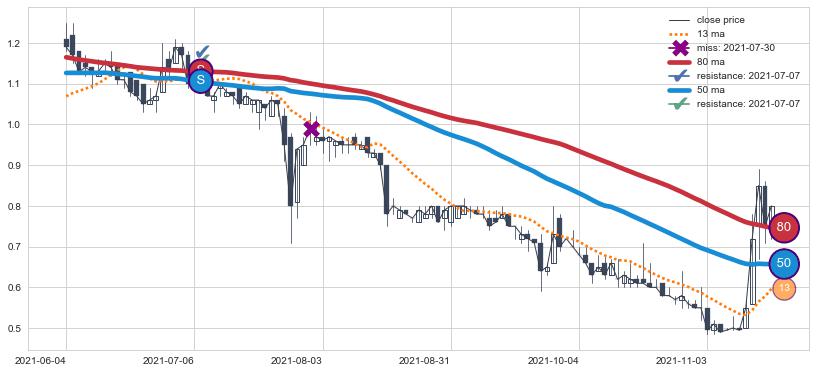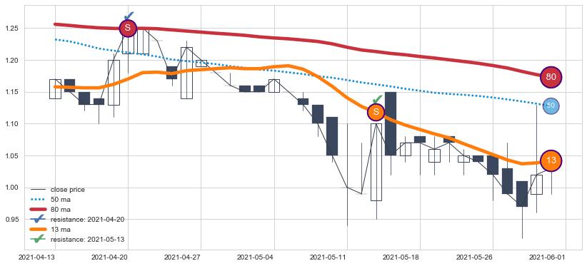 下跌趋势2021-04-13-2021-06-01,均线80, 13确认关键阻力2处