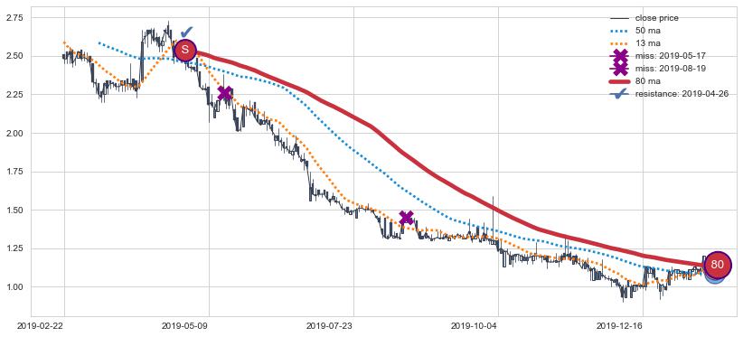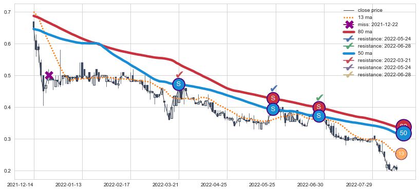 下跌趋势2021-12-14-2022-08-12,均线80, 50确认关键阻力3处