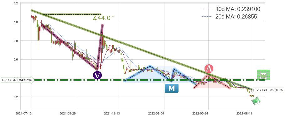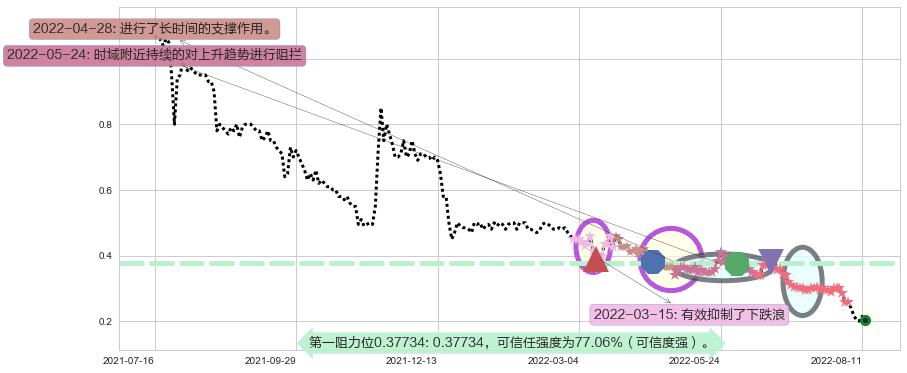 ♘ 阻力价格位0.37734,可信任强度77.06%,距离最后交易2022-08-12形成的收盘价格0.204000相差 +84.97%