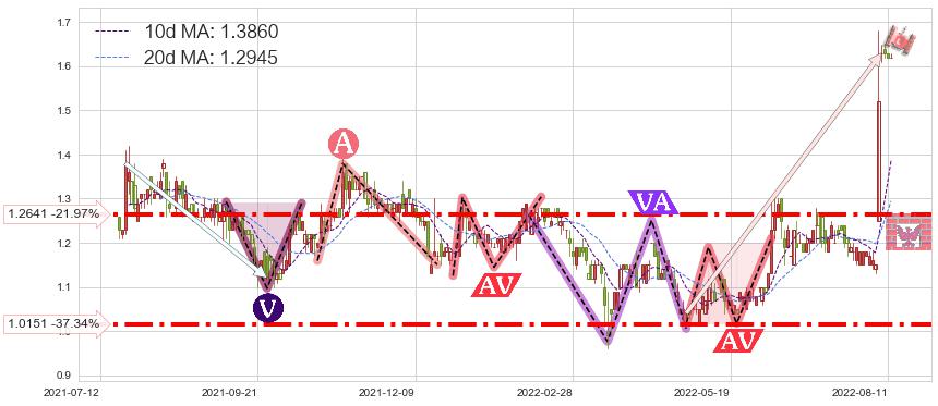 ♘ 支撑价格位1.2641,可信任强度82.81%,距离最后交易2022-08-12形成的收盘价格1.6200相差 -21.97%