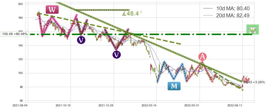 ♘ 阻力价格位156.08,可信任强度99.00%,距离最后交易2022-08-12形成的收盘价格83.70相差 +86.48%