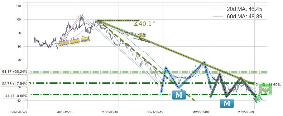 ♘ 阻力价格位52.78,可信任强度80.42%,距离最后交易2022-08-12形成的收盘价格44.90相差 +17.54%