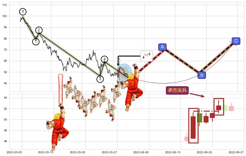 | 10 🅚:塔形底 | 圆底 ➕ 🌊:波浪理论猜想下跌浪5已形成,猜想后续形成abc反弹上涨(均值回复) ☞ 看多信号 ⇥ 【🅚线】交织【图形】⇥ 综合量化分数: 55 | > |