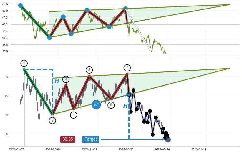 ➢ 最小中继整理跌幅→𝐇: 11.85 (𝐇楔型旗杆的长度:楔型起点→顶点)