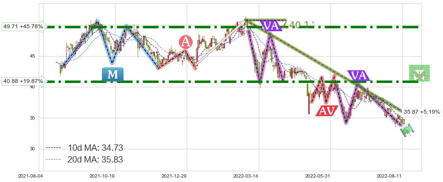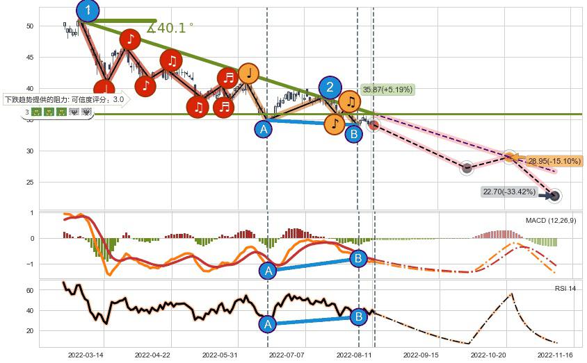 ♘ 阻力价格位40.88,可信任强度89.75%,距离最后交易2022-08-12形成的收盘价格34.10相差 +19.87%