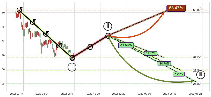➣ 循环浪继续向下【平均值】位置(2023-06-01, 29.51),匹配聚类样本比例46.87%, 可能性概率14.78%
