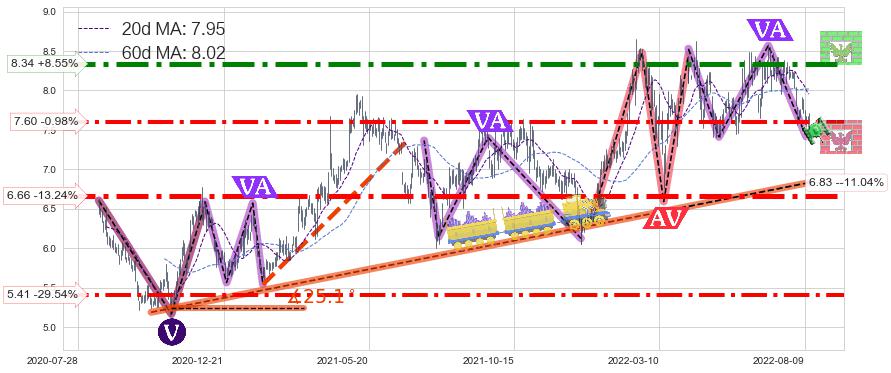 ♘ 支撑价格位7.60,可信任强度72.91%,距离最后交易2022-08-12形成的收盘价格7.68相差 -0.98%