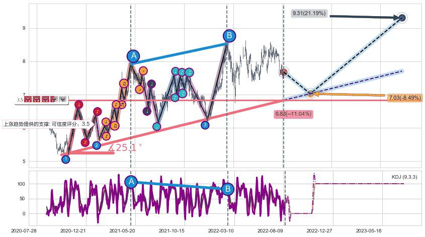 ♘ 在最后的上升阶段2020-10-08至2022-03-14存在 持续未破位的支撑位 ,支撑价格6.83,支撑可信任强度78.21%,其距离最后价格7.68相差 -11.04%
