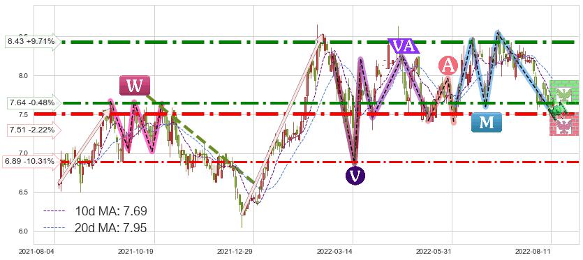♘ 阻力价格位7.64,可信任强度84.89%,距离最后交易2022-08-12形成的收盘价格7.68相差 -0.48%