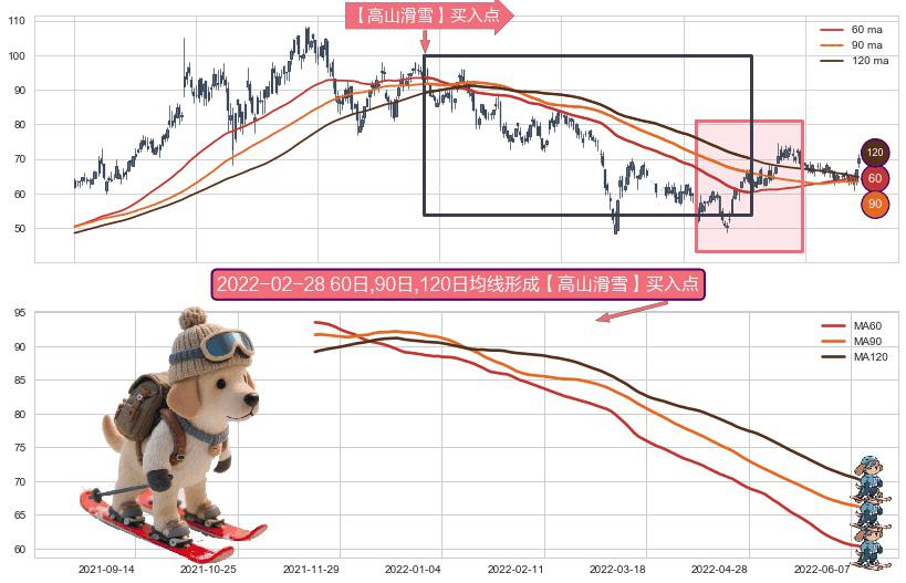 ⚀ 2021-11-19日-2022-06-09日显现 60日-90日-120日均线 【高山滑雪】买入点 看多信号,后市看涨,买入