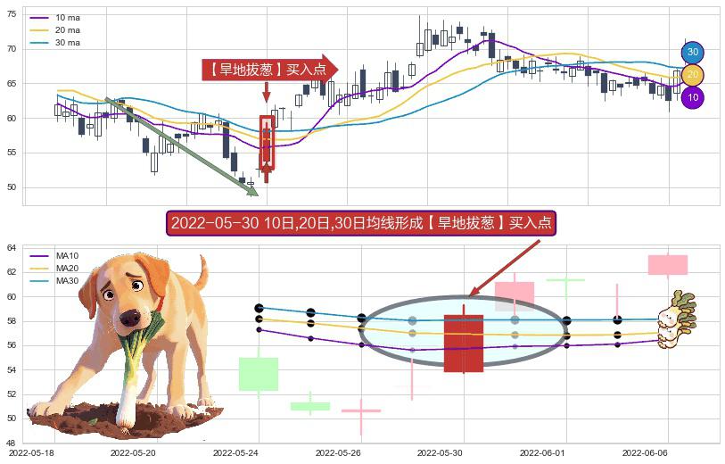⚀ 2022-05-30日显现 10日-20日-30日均线 【旱地拔葱】买入点 看多信号,后市看涨,买入