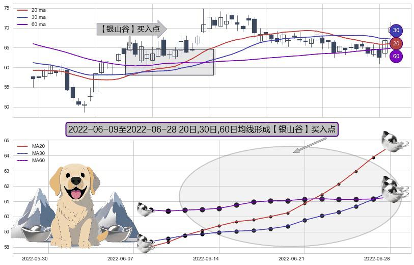 ⚀ 2022-06-10-日至2022-06-28-日显现 20日-30日-60日均线 【银山谷】买入点 看多信号,后市看涨,买入