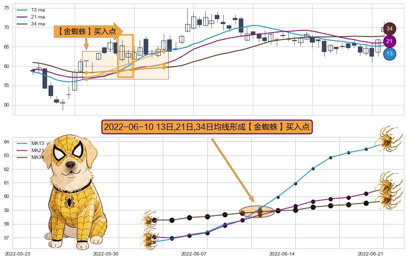 ⚀ 2022-06-10日显现 13日-21日-34日均线 【金蜘蛛】买入点 看多信号,后市看涨,买入