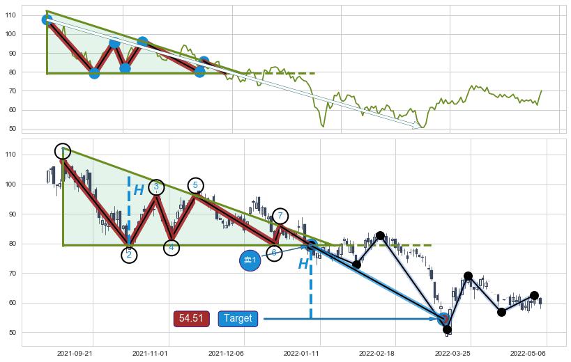 ➢ 【多方力量耗尽,空方打破攻守平衡点】下降三角形中继整理, 已在2022-01-06突破【支撑】颈线 79.35 →演变成下降通道
