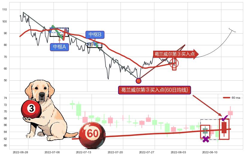 ➢ 低点影线(2022-06-13: 60.50 )→回踩→第二根k线低点(2022-06-06: 61.50 )