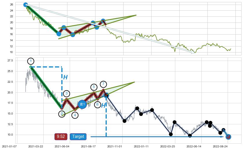 ➢ 最小中继整理跌幅→𝐇: 9.80 (𝐇楔型旗杆的长度:楔型起点→顶点)