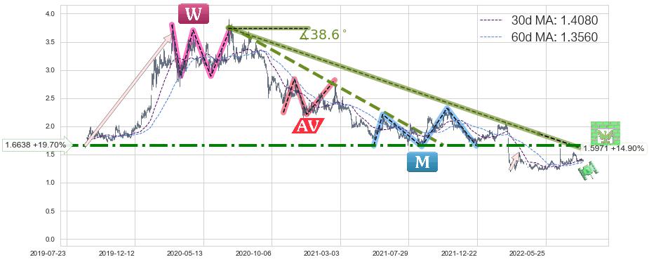 ♘ 阻力价格位1.6638,可信任强度82.24%,距离最后交易2022-08-12形成的收盘价格1.3900相差 +19.70%