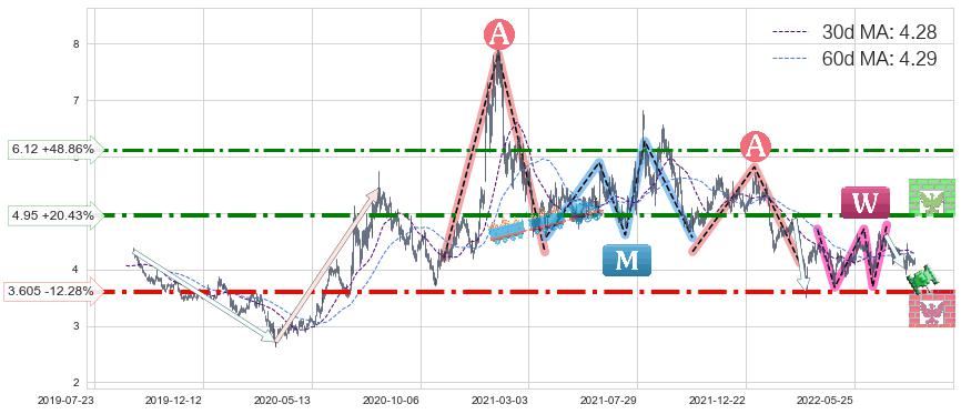 ♘ 阻力价格位4.95,可信任强度74.01%,距离最后交易2022-08-12形成的收盘价格4.11相差 +20.43%