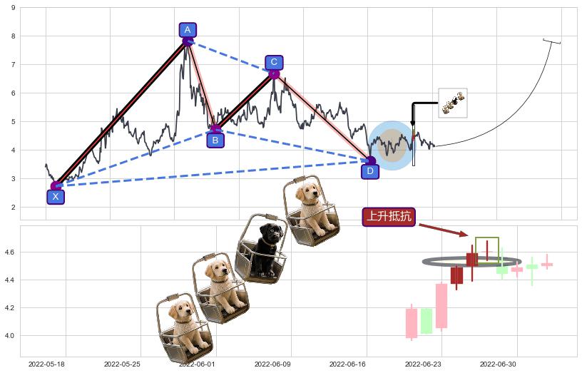 | 11 🅚:锤头线(锤子线) ➕ 📡:谐波伽利已到达d点:猜想c下行到达d点后报复性拉升上涨(均值回复) ☞ 看多信号 ⇥ 【🅚线】交织【图形】⇥ 综合量化分数: 54 | > |