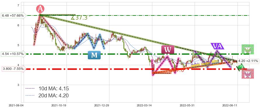 ♘ 阻力价格位4.54,可信任强度84.78%,距离最后交易2022-08-12形成的收盘价格4.11相差 +10.57%