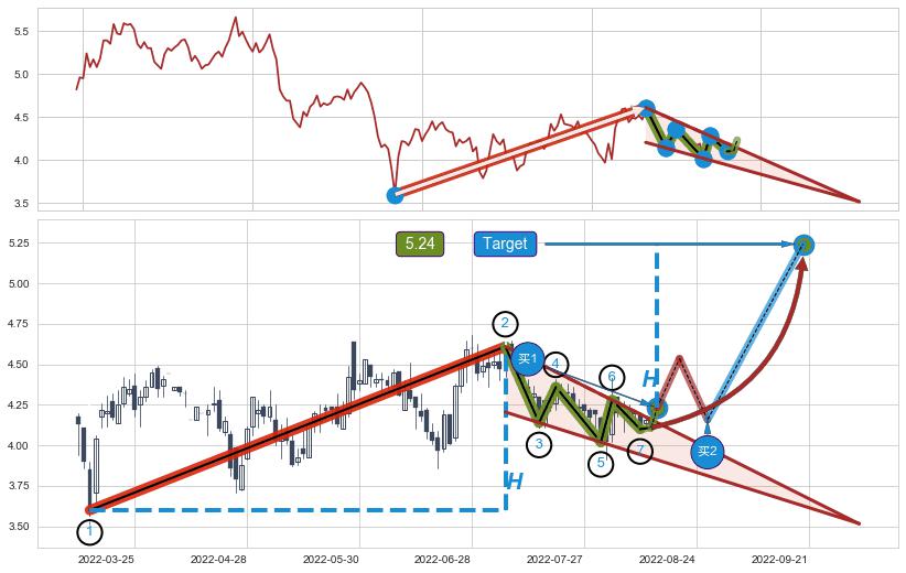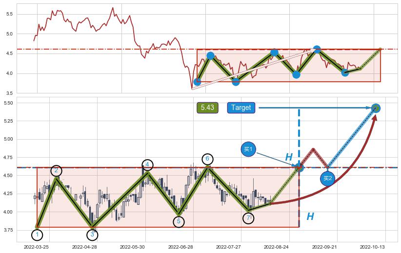 ➣ 【中枢B】:2022-05-12-2022-08-01,中枢由5笔构成,共56交易日, ZG=4.53, ZD=4.02