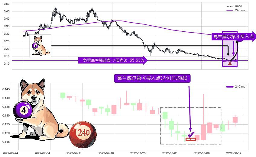 形态多维评估: ⚀ 2022-08-03-日显现 葛兰威尔均线 240日均线 第④买入点 下降趋势均值回复的短线反弹信号,后市看涨,买进信号