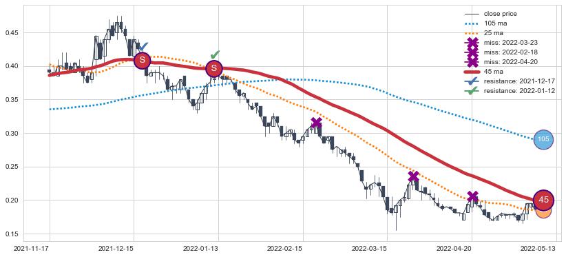 下跌趋势2021-11-17-2022-05-13,均线45确认关键阻力2处