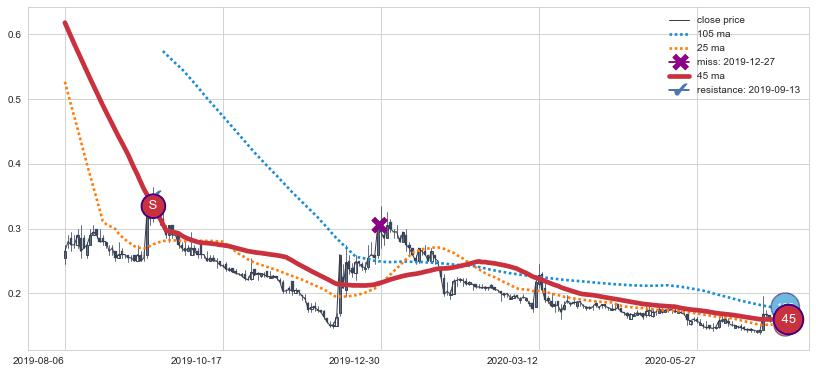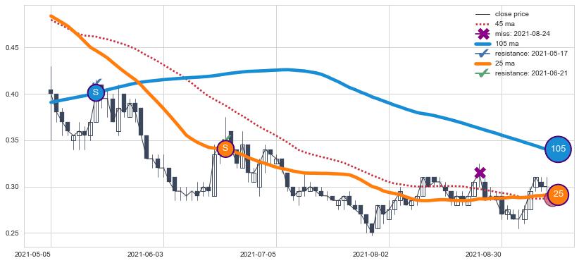 下跌趋势2021-05-05-2021-09-09,均线105, 25确认关键阻力2处