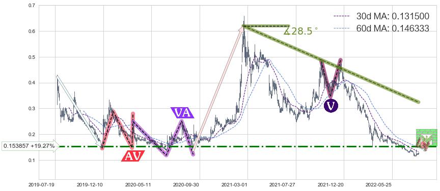 2022-03-16: 时域附近第一阻力位0.153857持续的对下跌趋势进行阻拦,有效地放缓了下跌的速度。