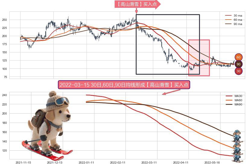 ⚀ 2022-01-04日-2022-05-27日显现 30日-60日-90日均线 【高山滑雪】买入点 看多信号,后市看涨,买入